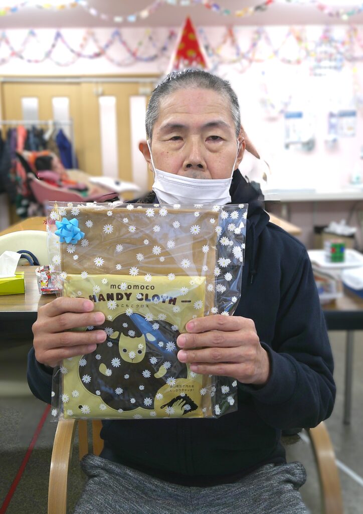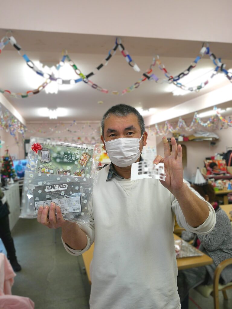 シャンメリーで乾杯し、コーヒーを飲みながらビンゴで盛り上がり、景品やお菓子などのプレゼントを受け取りつつ